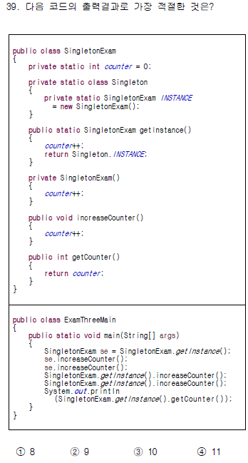 ▣ Java_소스코드_싱글톤패턴, static 메소드, Singleton 2020년 39번 정답 : 2번 싱글톤 패턴의 목적은 단 하나의 인스턴스를 만드는 것임. 소스코드에는 인스턴스를 만들 때 static메소드를 사용함 SingletonExam se = SingletonExam.getInstance(); SingletonExam클래스는 싱글톤 클래스임 SingetonExam가 처음 생성되었으므로 생성자인 SingletonExam()호출됨 (여기서 1이 증가됨) 그 다음 getInstance()메소드가 호출됨 (여기서 1이 증가됨) se.increaseCounter(); increaseCounter()메소드가 호출됨(여기서 1이 증가됨) 싱글톤이므로 인스턴스 하나임. 따라서 이전에 증가된 counter값..