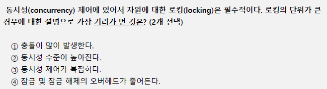 로킹 단위가 크면 -> 로크의 수가 적어진다. -> 제어 기법이 간단해 진다. -> 병행성이 감소한다.