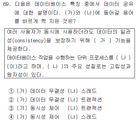 데이터베이스 작업을 수행하는 단위 프로세스를 트랜잭션이라고 하며, 트랜잭션의 주요 성질로는 고립성과 원자성이 있다.