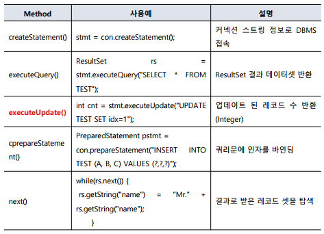 exeuteUpdate()는 SQL 질의문에 대한 투플이 아닌 업데이트 된 레코드 수를 반환함