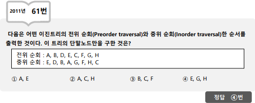 중위순회가 G로 시작하였으므로 단말 노드의 시작점은 G임.