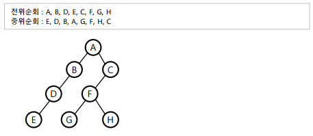 전위순회의 A, B, D, E와 중위순회의 E, D, B, A의 순서가 완전 반대임