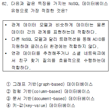 개체와 관계를 그래프 형태로 표현 질의는 그래프 순회를 통해 수행 그래프 이론에 기반(node, edge, property로 구성) 개체의 트랜잭션 ACID 지원 클러스터링 환경에는 적합하지 않음 추천 엔진, 소셜 네트워크, 이상 탐지, 패턴인식, 시멘틱웹, 온톨로지 분야 등에 유용 |