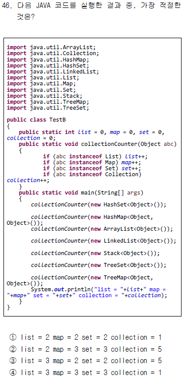 | TreeSet | Set의 하위 클래스이므로 Set을 1증가 시킴 Collection의 하위 클래스이므로 Collection을 1증가 시킴 |