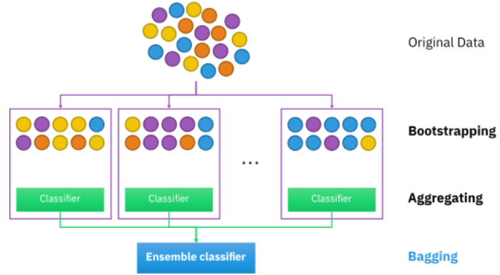 배깅(Bagging)은 부트스트랩(bootstrap)을 집계(Aggregating)하여 학습 데이터가 충분하지 않더라도 충분한 학습효과를 주어 높은 bias의 underfitting 문제나, 높은 variance로 인한 overfitting 문제를 해결하는데 도움을 줌