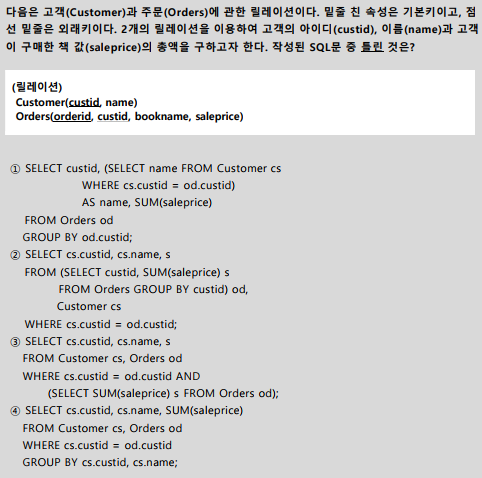 3번 '열한 번 이상 상품을 주문한 고객이름과 주문한 수량의 합을 구한다.' 정답임