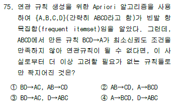 문제에서 BCD->A가 최소 신뢰도 조건을 만족하지 않는다고 했으므로, [BCD->A 신뢰도 = BCD ->A 지지도 / P(BCD)] 분모가 {B, C, D}의 부분집합으로 구성된 규칙의 신뢰도는 당연히 더 낮거나 같다는 결론이 나옴
