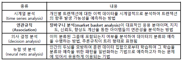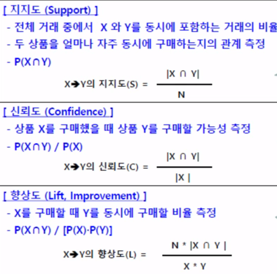 - 항목들 간의 관계를 얻기 위해 한 항목의 존재가 다른 항목의 존재를 암시하는 조합을 발견하는 분석 방법