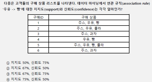 지지도 : (우유, 빵 동시 구매건수) / 전체건수 = 3/6 = 0.5 => 50%