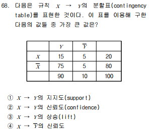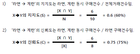 - 신뢰도는 X->Y ≠ Y->X (지지도가 낮아도 신뢰도가 높은 경우 유용한 규칙)