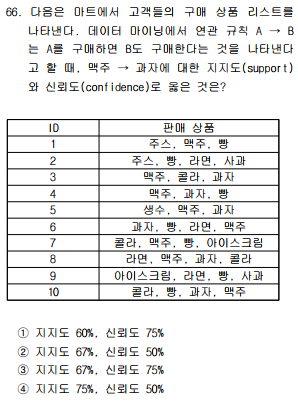 3) X→Y의 상승(향상도) = P(X∩Y)/[P(X)*P(Y)] = [신뢰도(X→Y)/P(Y) = 0.75/0.9 = 0.83333...