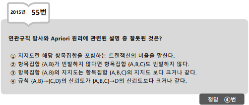 연관규칙(Association Rule) 탐사의 대표적인 알고리즘으로 연역적 알고리즘(Apriori algorithm)이 있음