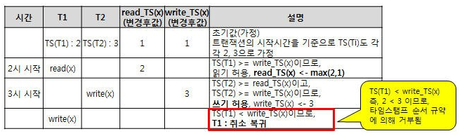 - 아니면, write(x)를 거부하고, Ti를 취소시켜 복귀시킴