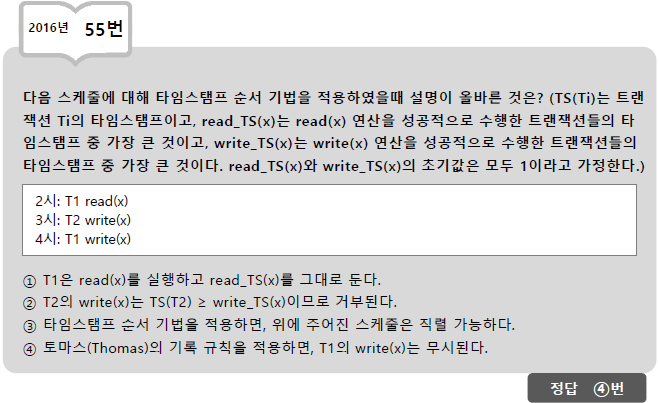 4) 토마스 기록 규칙을 적용하면 T1의 write(x)는 TS(T1) < write_TS(x) (2 < 3)이므로 실행한 것