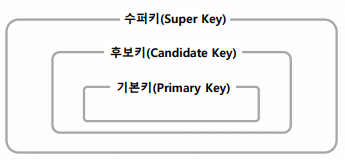 → 수퍼키 ⊃ 후보키 ⊃ 기본키