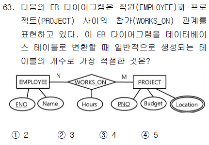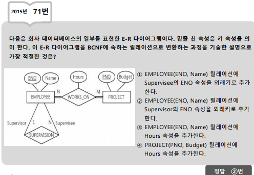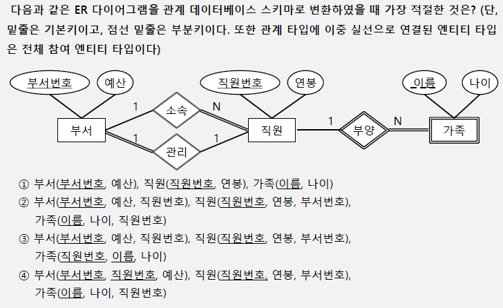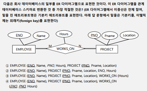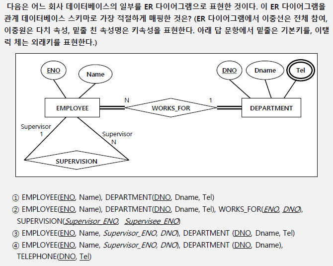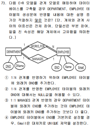 EMPLOYEE의 이탤릭체 DNO는 DEPARTMENT와의 참조 외래키임 따라서, ④번도 틀린 내용임
