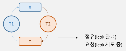 특정 자원에 대해 점유와 대기 Hold & Wait) 상태으로 교착상태 Deadlock) 이 발생함