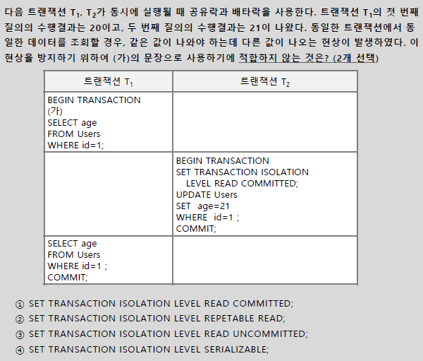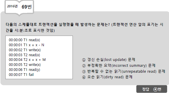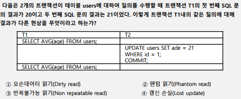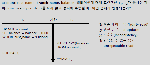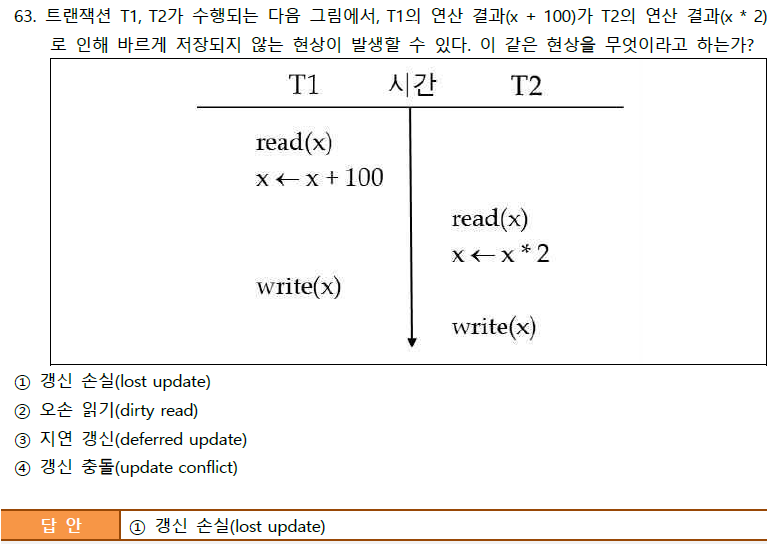 - 갱신 손실(Lost Update) : 두 개 이상의 트랜잭션이 같은 자료를 공유하여 갱신할 때 갱신 결과의 일부가 없어지는 현상