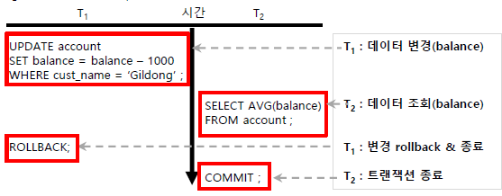 트랜잭션 T1에서 UPDATE 수행한 값을 트랜잭션 T2에서 읽어서 사용하고 있으나,