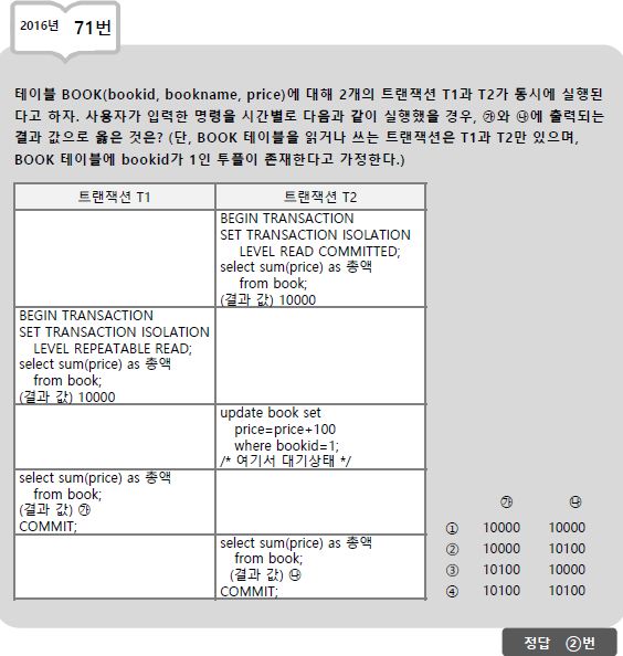 1) 트랜잭션 T1에서 수행하는 sum(price) 연산은 T2에서 이미 읽기/쓰기 연산이 실행된 상태
