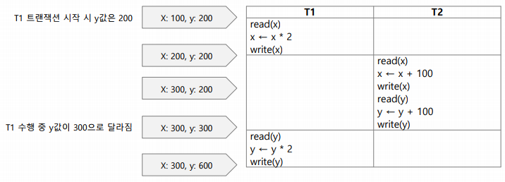 두 트랜잭션이 인터리빙 되어 병행 수행 될 때 원치 않는 자료를 이용함으로써 발생하는 현상