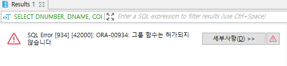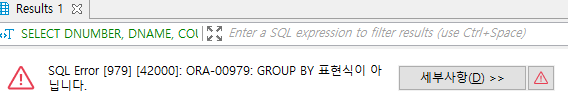 -- GROUP BY 절에 DNAME이 빠져 있어서, 구문오류발생