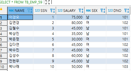 INSERT INTO TB_EMP_59 VALUES ('이경오', 1, 75000, '남', 101);