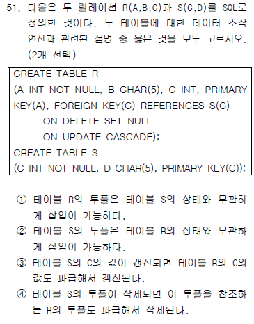 ▣ SQL_조작연산_무결성 제약 조건, 도메인, 키, 기본키 엔티티 무결성, 외래키, 참조 무결성 제약조건 구분 설명 도메인 제약조건 도메인 무결성 (Domain Constraint) 각 애트릐뷰트 값 -> 원자값 데이터형식을 통한 값 제한(정수형, 실수형, 문자형 등) 디폴트값 지정으로 범위 제한 NOT NULL 구문으로 값 존재 보장 키 제약조건 (Key constraint) 애트리뷰트에 중복된 값 존재 불가 릴레이션을 정의할 때 기본키, UNIQUE 명시한 애트리뷰트 중복X 기본키와 엔티티 무결성 제약조건 개체 무결성 (Entity Integrity Constraint) 두 개 이상의 투플이 동일한 기본키 값X 기본키는 NULL값 및 중복값을 가질수 없음 외래키와 참조 무결성 제약조건 (Refere..