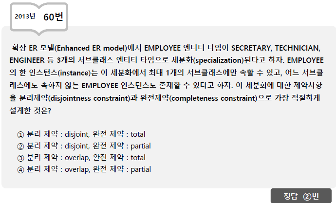 ▣ EE-R 모델, 확장 ER 제약 조건_분리 제약, 완전 제약, exclusive, disjoint, joint, overlap, total, partial, EER(Enhanced ER) 다이어그램, 수퍼타입, 서브타입 분리제약 완전제약 배타 (Exclusive, disjoint) 중복 (joint, overlap) 전체 (Total) 부분 (Partial) 서브 타입간 중복 허용 여부로 구분 직원 -> 정규직, 계약직(배타) 직원 -> 본사근무자, 장기근속자(중복가능) 서브타입 엔티티가 모두 존재하면 전체, 일부 서브타입은 엔티티가 없으면 부분 2013년 60번 정답 : 2번 EMPLOYEE의 한 인스턴스는 이 세분화에서 최대 1개의 서브클래스에만 속할수 있음 -> disjoint (베타) 어느 서..